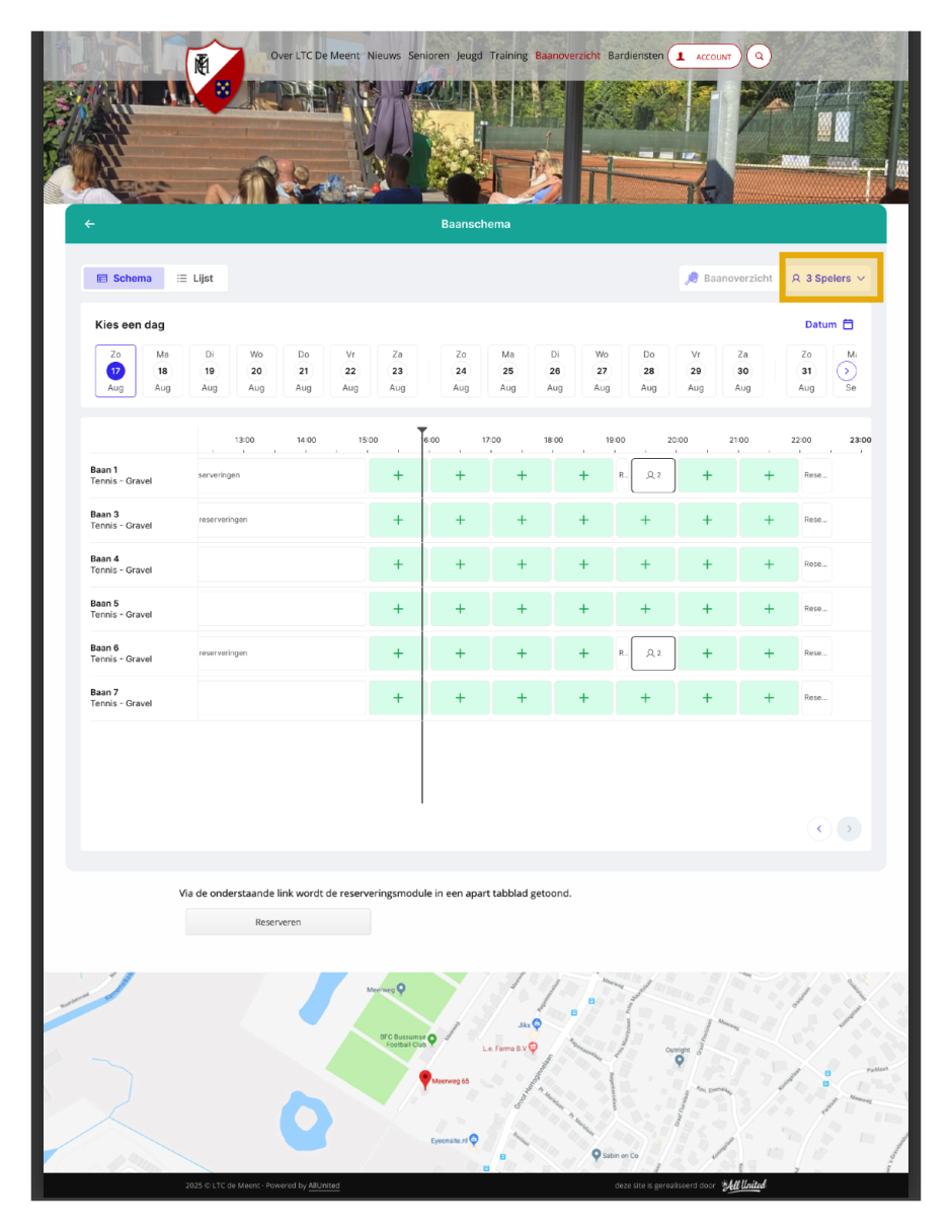 - Kies de dag en een tijdvak door op het + teken te klikken , selecteer je medespelers en bevestig de reservering