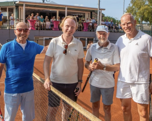 Toespraken en cadeaus, geheven glazen, felicitaties, omhelzingen en vrolijk feestrumoer volgden. De Club had zelfs de Burgemeester van Gooise Meren uitgenodigd, maar die was net met vakantie. Maar ter compensatie werd een tennismatch georganiseerd, die inmiddels heeft plaatsgevonden op 2 september. Een dubbel tussen de krasse knarren JaapF en Jan v Dongen (90 en 80) en de relatieve jonkies Burgemeester Han ter Heegde en Wethouder Sportzaken Jelmer Kruijt. Grote publieke belangstelling en de krasse knarren wonnen dit alleraardigste en vrolijke partijtje. Ook nu weer gevolgd door een feestelijke borrel.